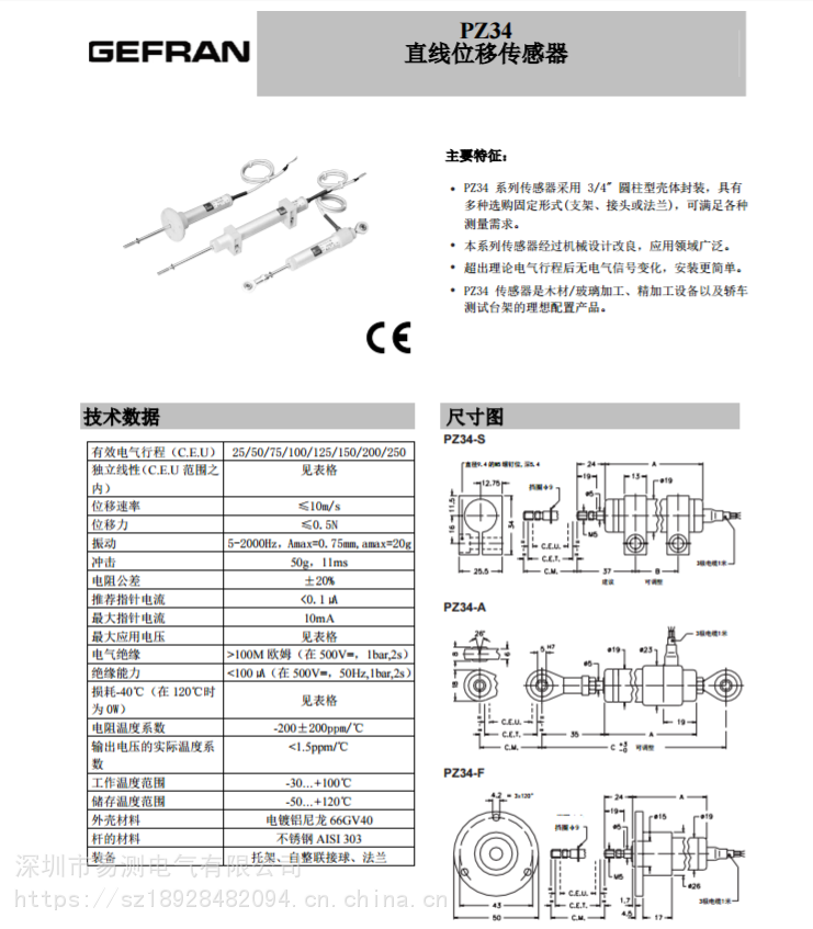 GEFRAN進口PZ34系列位移傳感器